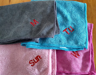 Right now it is brilliant - each night, I put that day's cloth into a mesh washing bag, and put out the next day's cloth. Because at the moment, I often find myself in the kitchen making the first morning cuppa, struggling to work out what day of the week it is! At least now it is written in front of me.