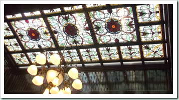 Amazing frosted glass windows, chandeliers, a stained glass ceiling, and more. Victorian styling and paintings everywhere